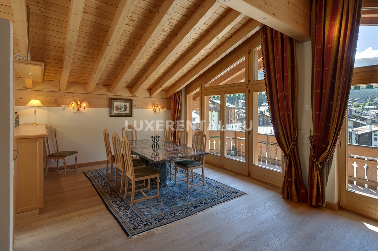 Пентхаус обращен на юг и имеет прекрасный вид на деревню и гору Маттерхорн. Наклонные потолки с деревянными балками создают особую атмосферу традиционного альпийского шале. На 3 балкона апартаментов можно выйти практически из каждой комнаты (кроме детской комнаты).