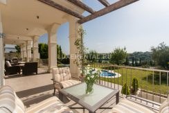 Вилла имеет частный сад площадью около 1800 кв.м. Вдоль переднего фасада виллы идет большая крытая терраса с элегантными арками. Здесь имеется профессиональная летняя кухня с грилем на углях, столовая на свежем воздухе, диваны и кресла для отдыха. Из сада открывается вид на поля для гольфа, холмы и море вдалеке. Также в саду в вашем распоряжении будет большой бассейн длиной 15 м с удобными римскими ступенями.