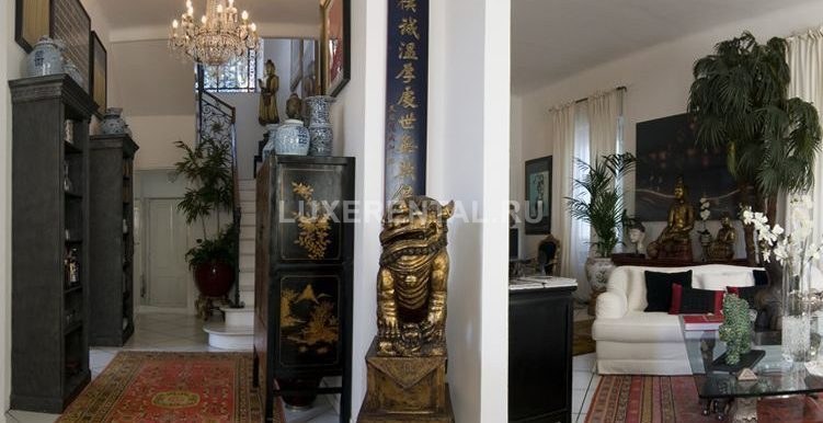 Первый этаж: вестибюль, просторная и стильно декорированная гостиная с большим ТВ и диванами, столовая, оборудованная кухня, спальня для персонала с ванной комнатой. В задней части виллы прачечная комната и внешняя парковка на 2 машины, куда можно попасть через автоматические ворота.