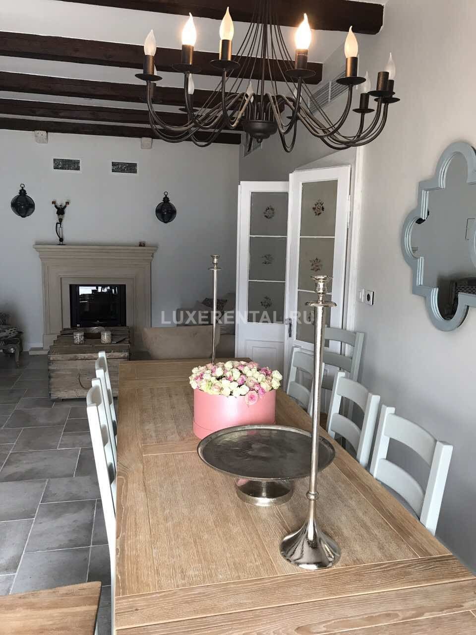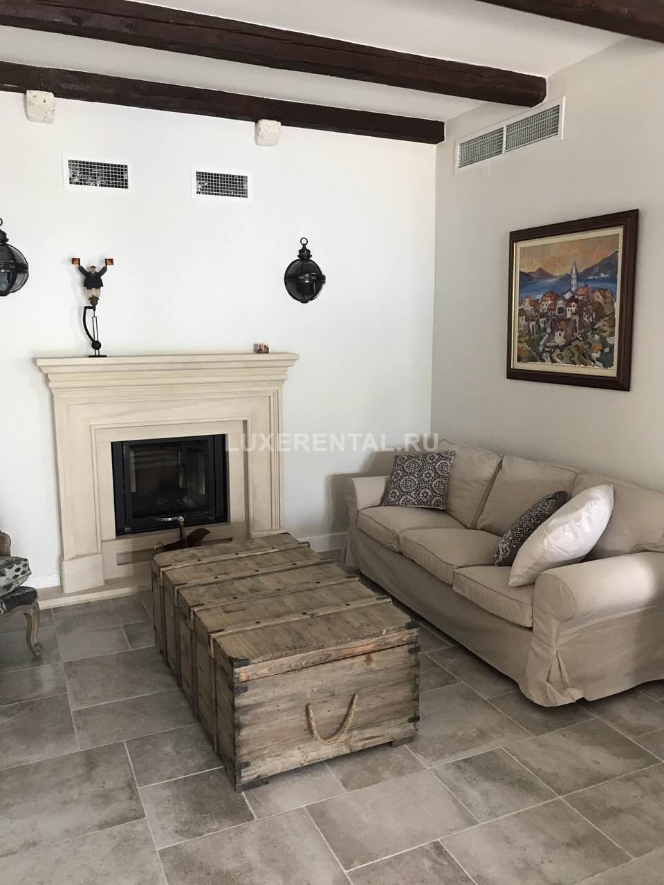 На первом этаже просторная гостиная с камином, спутниковым ТВ, доступом в интернет и столовой на 8-10 персон, кухня (холодильник / морозильник, плита, посудомоечная машина, микроволновая печь, кофеварка, посуда и столовые приборы) и терраса с выходом к морю. Большая терраса имеет гриль-зону и место для отдыха.