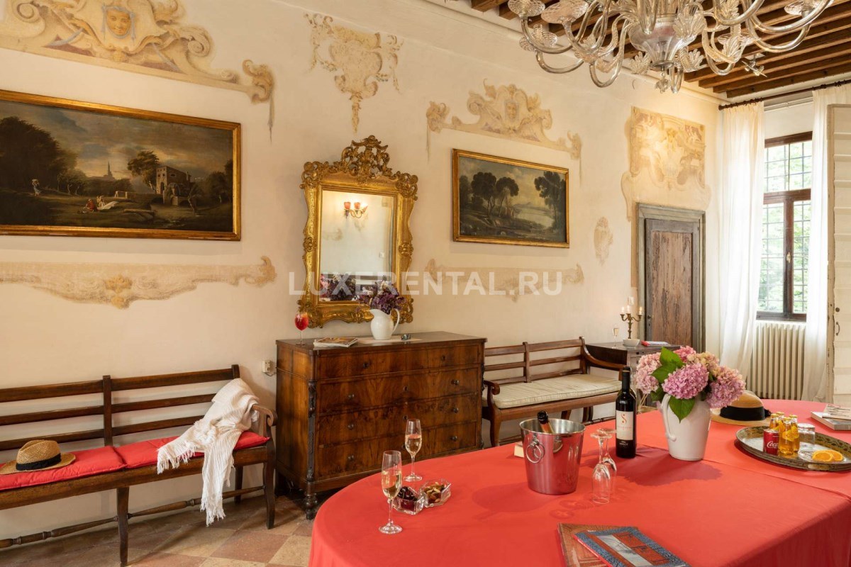 Эта красивая вилла была построена в 17 веке как загородный дом для важной венецианской семьи. За элегантным фасадом скрывается удивительный интерьер с потолочными балками и терракотовыми полами, которые были бережно отреставрированы при проведении ремонтных работ. Фрески украшают некоторые комнаты, являясь прекрасным фоном для антикварной мебели и контрастируя с современной, хорошо оборудованной кухней и спальнями с кондиционерами. Дом окружают обширные лужайки со статуями, подстриженными живыми изгородями и искусственным озером.