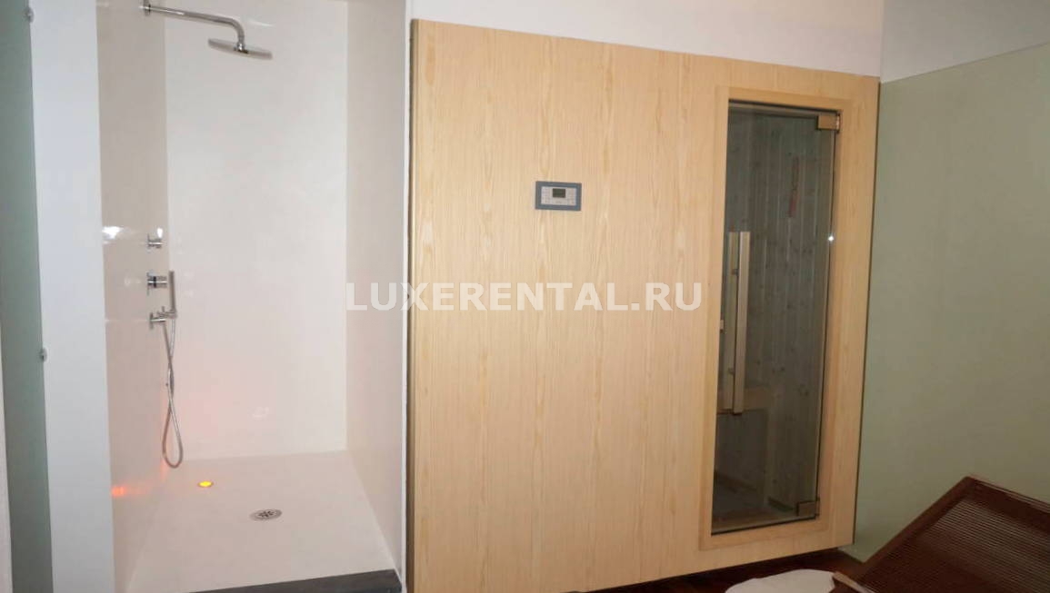 На цокольном этаже – седьмая спальня для персонала с отдельным с/узлом, вторая кухня, прачечная, зона wellness c спортзалом (Tecnogym), сауной и душевой.